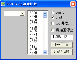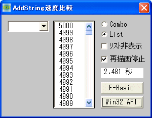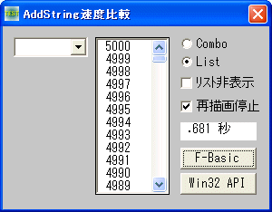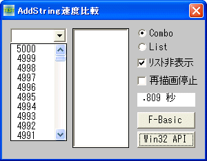 F-BasicでのAddStringと、SendNessageでCB_ADDSTRING(LB_ADDSTRING)を送った場合の速度をを比較してみます。
