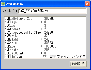 エディットボックスにAVIファイルをドロップダウン入力し、『Info取得』をクリックし、情報を取得します。