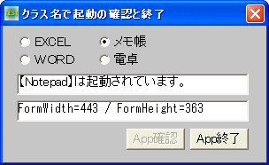 '================================================================ '= クラス名で起動の確認と終了 '= (FindWindow4.bas) '================================================================ #include "Windows.bi" Type RECT Left As Long Top As Long Right As Long Bottom As Long End Type ' ウィンドウの座標をスクリーン座標系で取得 Declare Function Api_GetWindowRect& Lib "user32" Alias "GetWindowRect" (ByVal hWnd&, lpRect As RECT) ' クラス名またはキャプションを与えてウィンドウのハンドルを取得 Declare Function Api_FindWindow& Lib "user32" Alias "FindWindowA" (ByVal lpClassName$, ByVal lpWindowName$) ' ウィンドウにメッセージを送信。この関数は、指定したウィンドウのウィンドウプロシージャが処理を終了するまで制御を返さない Declare Function Api_SendMessage& Lib "user32" Alias "SendMessageA" (ByVal hWnd&, ByVal wMsg&, ByVal wParam&, lParam As Any) #define WM_CLOSE &H10 'ウィンドウ或いはアプリケーションをクローズされた #define vbNullString byval 0 '値0の文字列。値0を持つ文字列。空文字列ではない Var Shared Radio(3) As Object Var Shared Text(1) As Object Var Shared Button(2) As Object For i = 0 To 3 If i < 2 Then Text(i).Attach GetDlgItem("Text" & Trim$(Str$(i + 1))) : Text(i).SetFontSize 14 If i < 3 Then Button(i).Attach GetDlgItem("Button" & Trim$(Str$(i + 1))) : Button(i).SetFontSize 14 Radio(i).Attach GetDlgItem("Radio" & Trim$(Str$(i + 1))) : Radio(i).SetFontSize 14 Next Var Shared rd(3) As String Var Shared Flg As byte Var Shared hWnd As Long Var Shared FileName As String '================================================================ '= クラス名で起動の確認と終了 '================================================================ Declare Sub MainForm_Start edecl () Sub MainForm_Start() rd(0) = "XLMAIN" rd(1) = "OpusApp" rd(2) = "Notepad" rd(3) = "SciCalc" Flg = 0 FileName = "Excel.exe" Button(1).EnableWindow 0 End Sub '================================================================ '= クラス名で起動の確認と終了 '================================================================ Declare Sub Button1_on edecl () Sub Button1_on() Var rct As RECT Var Ret As Long 'クラス名を与えてAPPのハンドルを取得 '起動中ならハンドルが返り、起動していなければ0が返る hWnd = Api_FindWindow(rd(Flg), vbNullString) Ret = Api_GetWindowRect(hWnd, rct) If hWnd = 0 Then Text(1).ShowWindow 0 Text(0).SetWindowText "【" & rd(Flg) & "】は起動されていません。" Button(0).EnableWindow -1 Button(1).EnableWindow 0 Else Text(1).ShowWindow -1 Text(0).SetWindowText "【" & rd(Flg) & "】は起動されています。" Text(1).SetWindowText "FormWidth=" & Trim$(Str$(rct.Right - rct.Left)) & " / FormHeight=" & Trim$(Str$(rct.Bottom - rct.Top)) Button(0).EnableWindow 0 Button(1).EnableWindow -1 End If End Sub '================================================================ '= 確認と終了 '================================================================ Declare Sub Button2_on edecl () Sub Button2_on() 'エクセル(アプリ)が起動中なら終了する場合 '指定のハンドルに終了のメッセージを送る Ret = Api_SendMessage(hWnd, WM_CLOSE, 0, 0) Text(0).SetWindowText "【" & rd(Flg) & "】は終了しました。" Text(1).SetWindowText "" Wait 100 Button(0).EnableWindow -1 Button(1).EnableWindow 0 Text(0).SetWindowText "" End Sub '================================================================ '= 起動 '================================================================ Declare Sub Button3_on edecl () Sub Button3_on() Shell FileName, , 5 End Sub '================================================================ '= '================================================================ Declare Sub Radio1_on edecl () Sub Radio1_on() Flg = 0 FileName = "Excel.exe" End Sub Declare Sub Radio2_on edecl () Sub Radio2_on() Flg = 1 FileName = "Winword.exe" End Sub Declare Sub Radio3_on edecl () Sub Radio3_on() Flg = 2 FileName = "Notepad.exe" End Sub Declare Sub Radio4_on edecl () Sub Radio4_on() Flg = 3 FileName = "Calc.exe" End Sub '================================================================ '= クラス名で起動の確認と終了 '================================================================ While 1 WaitEvent Wend STop End