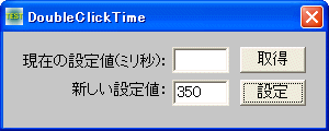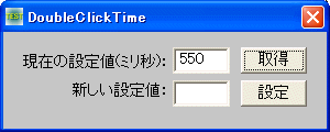 '= (DoubleClickTime.bas) '================================================================ #include "Windows.bi" ' ダブルクリック時間の取得 Declare Function Api_SetDoubleClickTime& Lib "user32" Alias "SetDoubleClickTime" (ByVal wCount&) ' ダブルクリック時間の取得 Declare Function Api_GetDoubleClickTime& Lib "user32" Alias "GetDoubleClickTime" () Var Shared Text2 As Object Text2.Attach GetDLgItem("Text2") Text2.SetFontSize 14 Var Shared Dct As Long 'ダブルクリック時間 '================================================================ '= '================================================================ Declare Sub Button1_on edecl () Sub Button1_on() Dct = Api_GetDoubleClickTime 'ダブルクリック時間取得 Text2.SetWindowText Str$(Dct) End Sub '================================================================ '= '================================================================ Declare Sub Button2_on edecl () Sub Button2_on() Var Ret As Long Dct = val(GetDlgItemText("Edit1")) If Dct = 0 Then Exit Sub Ret = Api_SetDoubleClickTime(Dct) 'ダブルクリック時間設定 Text2.SetWindowText "" End Sub '================================================================ '= '================================================================ While 1 WaitEvent Wend Stop End