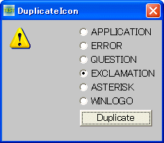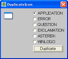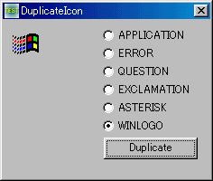 '================================================================ '= システムアイコンの複製 '= (DuplicateIcon.bas) '================================================================ #include "Windows.bi" #define IDI_APPLICATION 32512 #define IDI_HAND 32513 #define IDI_ERROR 32513 'IDI_HAND #define IDI_QUESTION 32514 #define IDI_WARNING 32515 'IDI_EXCLAMATION #define IDI_EXCLAMATION 32515 #define IDI_ASTERISK 32516 #define IDI_INFORMATION 32516 'IDI_ASTERISK #define IDI_WINLOGO 32517 ' アイコンの複製 Declare Function Api_DuplicateIcon& Lib "shell32" Alias "DuplicateIcon" (ByVal hInst&, ByVal hIcon&) ' アイコンのハンドルを解放 Declare Function Api_DestroyIcon& Lib "user32" Alias "DestroyIcon" (ByVal hIcon&) ' アイコンを描画 Declare Function Api_DrawIcon& Lib "user32" Alias "DrawIcon" (ByVal hDC&, ByVal x&, ByVal y&, ByVal exhIcon&) ' アイコン読込 Declare Function Api_LoadIcon& Lib "user32" Alias "LoadIconA" (ByVal hInstance&, ByVal lpIconName&) ' 指定されたウィンドウのクライアント領域または画面全体を表すディスプレイデバイスコンテキストのハンドルを取得 Declare Function Api_GetDC& Lib "user32" Alias "GetDC" (ByVal hWnd&) ' デバイスコンテキストを解放 Declare Function Api_ReleaseDC& Lib "user32" Alias "ReleaseDC" (ByVal hWnd&, ByVal hDC&) Var Shared Radio(5) As Object Var Shared Button1 As Object For i = 0 To 5 Radio(i).Attach GetDlgItem("Radio" & Trim$(Str$(i + 1))) : Radio(i).SetFontSize 14 Next i Button1.Attach GetDlgItem("Button1") : Button1.SetFontSize 14 '================================================================ '= '================================================================ Declare Function Index bdecl () As Integer Function Index() Index = Val(Mid$(GetDlgRadioSelect("Radio1"), 6)) - 1 End Function '================================================================ '= '================================================================ Declare Sub Button1_on edecl () Sub Button1_on() Var Ret As Long Var hDC As Long Var hIcon As Long Var hDuplIcon As Long hDC = Api_GetDC(GetHwnd) Select Case Index Case 0 hIcon = Api_LoadIcon(ByVal 0, IDI_APPLICATION) Case 1 hIcon = Api_LoadIcon(ByVal 0, IDI_ERROR) Case 2 hIcon = Api_LoadIcon(ByVal 0, IDI_QUESTION) Case 3 hIcon = Api_LoadIcon(ByVal 0, IDI_EXCLAMATION) Case 4 hIcon = Api_LoadIcon(ByVal 0, IDI_ASTERISK) Case 5 hIcon = Api_LoadIcon(ByVal 0, IDI_WINLOGO) End Select Cls hDuplIcon = Api_DuplicateIcon(ByVal 0, hIcon) Ret = Api_DrawIcon(hDC, 10, 10, hDuplIcon) Ret = Api_DestroyIcon(hIcon) Ret = Api_DestroyIcon(hDuplIcon) Ret = Api_ReleaseDC(GetHwnd, hDC) End Sub '================================================================ '= '================================================================ While 1 WaitEvent Wend Stop End