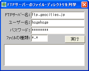 例では、geocitiesのFTPサーバーにあるディレクトリおよびファイルを列挙しています。当然ユーザー名とパスワードは本物を入力します。