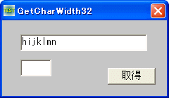 '= (GetCharWidth32.bas) '================================================================ #include "Windows.bi" ' 文字の幅を論理単位で取得(昇順に連続した文字[AからEまで、SからTまで、など]の幅を一括して取得) Declare Function Api_GetCharWidth32& Lib "gdi32" Alias "GetCharWidthA" (ByVal hDC&, ByVal iFirstChar&, ByVal iLastChar&, lpBuffer As Any) ' 指定されたウィンドウのクライアント領域または画面全体を表すディスプレイデバイスコンテキストのハンドルを取得 Declare Function Api_GetDC& Lib "user32" Alias "GetDC" (ByVal hWnd&) ' デバイスコンテキストを解放 Declare Function Api_ReleaseDC& Lib "user32" Alias "ReleaseDC" (ByVal hWnd&, ByVal hDC&) Var Shared Edit1 As Object Var Shared Text1 As Object Var Shared Button1 As Object Edit1.Attach GetDlgItem("Edit1") : Edit1.SetFontSize 14 Text1.Attach GetDlgItem("Text1") : Text1.SetFontSize 14 Button1.Attach GetDlgItem("Button1") : Button1.SetFontSize 14 '================================================================ '= '================================================================ Declare Function sGetTextWidth(strText As String) As Long Function sGetTextWidth(strText As String) As Long Var tWidth As Long Var TotalWidth As Long Var i As Integer Var hDC As Long Var Ret As Long hDC = Api_GetDC(Edit1.GethWnd) For i = 1 To Len(strText) Ret = Api_GetCharWidth32(hDC, Asc(Mid$(strText, i, 1)), Asc(Mid$(strText, i, 1)), tWidth) TotalWidth = TotalWidth + tWidth Next i