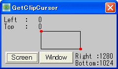 左:デスクトップの移動領域取得 右:ウインドウ(フォーム)の移動領域取得/ClipCursorでマウス移動はフォーム内に制限しています。