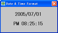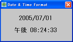 '================================================================ '= 日付・時刻の書式を取得 '= (GetDateFormat.bas) '================================================================ #include "Windows.bi" Type SYSTEMTIME wYear As Integer wMonth As Integer wDayOfWeek As Integer wDay As Integer wHour As Integer wMinute As Integer wSecond As Integer wMilliseconds As Integer End Type ' 日付表示の書式を取得 Declare Function Api_GetDateFormat& Lib "Kernel32" Alias "GetDateFormatA" (ByVal Locale&, ByVal dwFlags&, lpDate As SYSTEMTIME, ByVal lpFormat$, ByVal lpDateStr$, ByVal cchDate&) ' 時刻をフォーマットし、指定された地域に対応する時刻文字列を作成 Declare Function Api_GetTimeFormat& Lib "kernel32" Alias "GetTimeFormatA" (ByVal Locale&, ByVal dwFlags&, lpTime As SYSTEMTIME, ByVal lpFormat As Any, ByVal lpTimeStr$, ByVal cchTime&) Var Shared Text1 As Object Var Shared Text2 As Object Var Shared Timer1 As Object Text1.Attach GetDlgItem("Text1") : Text1.SetFontSize 20 Text2.Attach GetDlgItem("Text2") : Text2.SetFontSize 20 Timer1.Attach GetDlgItem("Timer1") '================================================================ '= '================================================================ Declare Sub MainForm_Start edecl () Sub MainForm_Start() Timer1.SetInterval 100 Timer1.Enable -1 End Sub '================================================================ '= '================================================================ Declare Sub Timer1_Timer edecl () Sub Timer1_Timer() Var Buffer As String Var st As SYSTEMTIME Var Ret As Long st.wDay = Val(Right$(Today$, 2)) st.wMonth = Val(Mid$(Today$, 6, 2)) st.wYear = Val(Left$(Today$, 4)) st.wHour = Val(Left$(Time$, 2)) st.wMinute = Val(Mid$(Time$, 4, 2)) st.wSecond = Val(Right$(Time$, 2)) Buffer = String$(255, 0) Ret = Api_GetDateFormat(ByVal 0, 0, st, ByVal 0, Buffer, Len(Buffer)) Buffer = Left$(Buffer, InStr(1, Buffer, Chr$(0)) - 1) Text1.SetWindowText Buffer Buffer = String$(255, 0) Ret = Api_GetTimeFormat(ByVal 0, 0, st, ByVal 0, Buffer, Len(Buffer)) Buffer = Left$(Buffer, InStr(1, Buffer, Chr$(0)) - 1) Text2.SetWindowText Buffer End Sub '================================================================ '= '================================================================ While 1 WaitEvent Wend Stop End