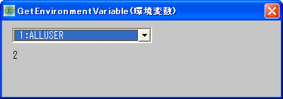 '= (GetEnvironmentVariable.bas) '================================================================ #include "Windows.bi" ' 環境変数取得 Declare Function Api_GetEnvironmentVariable& Lib "kernel32" Alias "GetEnvironmentVariableA" (ByVal lpszName$, ByVal lpszValue$, ByVal cchValue&) Var Shared Text1 As Object Var Shared Combo1 As Object Text1.Attach GetDlgItem("Text1") : Text1.SetFontSize 14 Combo1.Attach GetDlgItem("Combo1") : Combo1.SetFontSize 14 Var Shared kh(29) As String '================================================================ '= '================================================================ Declare Function GetEnv(sName As String) As String Function GetEnv(sName As String) As String Var Buffer As String Var Size As Long Var Ret As Long GetEnv = "" Buffer = String$(512, Chr$(0)) Size = Api_GetEnvironmentVariable(sName, Buffer, 512) If Size = 0 Then Else If Size <= 512 Then GetEnv = Left$(Buffer, InStr(Buffer, Chr$(0)) - 1) Else Buffer = String$(Size, Chr$(0)) Ret = Api_GetEnvironmentVariable(sName, Buffer, Size) If Ret = Size - 1 Then GetEnv = Left$(Buffer, InStr(Buffer, Chr$(0)) - 1) End If End If End Function '================================================================ '= '================================================================ Declare Sub MainForm_Start edecl () Sub mainForm_Start() Combo1.ResetContent For i = 1 To 29 Read kh(i) Combo1.AddString Format$(i,"##:") & kh(i) Next '-------------------- data ALLUSER data ALLUSERSPROFILE data APPDATA data CLIENTNAME data CommonProgramFiles data COMPUTERNAME data ComSpec data FP_NO_HOST_CHECK data HOMEDRIVE data HOMEPATH data LOGONSERVER data NUMBER_OF_PROCESSORS data OS data Path data PATHEXT data PROCESSOR_ARCHITECTURE data PROCESSOR_IDENTIFIER data PROCESSOR_LEVEL data PROCESSOR_REVISION data ProgramFiles data SESSIONNAME data SystemDrive data SystemRoot data TEMP data TMP data USERDOMAIN data USERNAME data USERPROFILE data WINDIR End Sub '================================================================ '= '================================================================ Declare Sub Combo1_Change edecl () Sub Combo1_Change() Var index As Long index = Combo1.GetCursel + 1 Text1.SetWindowText GetEnv(kh(index)) End Sub '================================================================ '= '================================================================ While 1 WaitEvent Wend Stop End