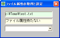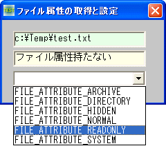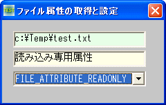 あらかじめ 同じフォルダに適当なファイル(例:TEST.TXT)を作成しておきます。起動するとファイ名と現在の属性を表示します。