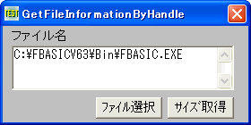 '================================================================ '= ファイルサイズの取得(V) '= (GetFileInformationByHandle.bas) '================================================================ #include "Windows.bi" #define OPEN_EXISTING 3 'ファイルをオープンする(存在しない場合失敗) Type FILETIME dwLowDateTime As Long dwHighDateTime As Long End Type Type BY_HANDLE_FILE_INFORMATION dwFileAttributes As Long ftCreationTime As FILETIME ftLastAccessTime As FILETIME ftLastWriteTime As FILETIME dwVolumeSerialNumber As Long nFileSizeHigh As Long nFileSizeLow As Long nNumberOfLinks As Long nFileIndexHigh As Long nFileIndexLow As Long End Type ' 指定したファイルをオープンし、デバイスハンドルを返す Declare Function Api_CreateFile& Lib "kernel32" Alias "CreateFileA" (ByVal lpFileName$, ByVal dwDesiredAccess&, ByVal dwShareMode&, lpSecurityAttributes As Any, ByVal dwCreationDisposition&, ByVal dwFlagsAndAttributes&, ByVal hTemplateFile&) ' 指定されたファイルに関する情報を取得 Declare Function Api_GetFileInformationByHandle& Lib "kernel32" Alias "GetFileInformationByHandle" (ByVal hFile&, lpFileInformation As BY_HANDLE_FILE_INFORMATION) ' オープンされているオブジェクトハンドルをクローズ Declare Function Api_CloseHandle& Lib "kernel32" Alias "CloseHandle" (ByVal hObject&) Var Shared FileName As String Var Shared Text1 As Object Var Shared Edit1 As Object Var Shared Button1 As Object Var Shared Button2 As Object Text1.Attach GetDlgItem("Text1") : Text1.SetFontSize 14 Edit1.Attach GetDlgItem("Edit1") : Edit1.SetFontSize 14 Button1.Attach GetDlgItem("Button1") : Button1.SetFontSize 14 Button2.Attach GetDlgItem("Button2") : Button2.SetFontSize 14 '================================================================ '= '================================================================ Declare Sub Button1_on edecl () Sub Button1_on() Edit1.SetWindowText "" FileName = WinOpenDlg("ファイルのオープン","C:\*.*","全てのファイル(*.*)", 0) If FileName <> Chr$(&H1B) Then Edit1.SetWindowText FileName End If End Sub '================================================================ '= '================================================================ Declare Sub Button2_on edecl () Sub Button2_on() Var hFile As Long Var FileInfo As BY_HANDLE_FILE_INFORMATION Var Ret As Long 'ファイルをオープンし、デバイスハンドルを返す hFile = Api_CreateFile(FileName, 0, 0, ByVal 0, OPEN_EXISTING, 0, ByVal 0) 'ファイルに関する情報を取得 Ret = Api_GetFileInformationByHandle(hFile, FileInfo) 'ハンドルをクローズ Ret = Api_CloseHandle(hFile) '結果表示 Edit1.SetWindowText FileName & Chr$(13, 10) & "File size: " & format$(FileInfo.nFileSizeLow, "###,###,### バイト") End Sub '================================================================ '= '================================================================ While 1 WaitEvent Wend Stop End