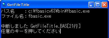 '= (GetFileTitle.bas) '================================================================ #include "Windows.bi" ' パスからファイル名を取得 Declare Function Api_GetFileTitle% Lib "comdlg32" Alias "GetFileTitleA" (ByVal lpszFile$, ByVal lpszTitle$, ByVal cbBuf%) Var TestString As String Var Buffer As String Var Ret As Integer Buffer = string$(255, 0) TestString = "c:\fbasicv63\bin\fbasic.exe" Ret = Api_GetFileTitle(TestString, Buffer, len(Buffer)) Buffer = left$(Buffer, instr(1, Buffer, Chr$(0)) - 1) Print "パス名 :" & TestString Print "ファイル名:" & Buffer Stop End
