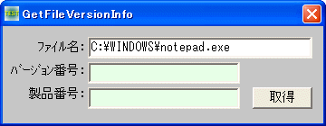 初期状態では、既知のnotepad.exeファイルパスをしていしています。ファイル名欄に、フルパスを指定し『取得』ボタンをクリックするとファイルバージョンおよび製品バージョンが表示されます。