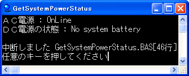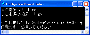 '================================================================ '= 電源(AC・DC)の状態を取得 '= (GetSystemPowerStatus.bas) '================================================================ Type SYSTEM_POWER_STATUS ACLineStatus As Byte 'ACパワーの状態を示す定数の組み合わせ BatteryFlag As Byte 'バッテリチャージの状態を表す定数の組み合わせ BatteryLifePercent As Byte 'バッテリの残り容量のパーセント(0〜100) Reserved1 As Byte '常に0 BatteryLifeTime As Long 'バッテリーの残り秒数 BatteryFullLifeTime As Long 'フルチャージ時の残り秒数 End Type ' 電源の状態を取得 Declare Function Api_GetSystemPowerStatus& Lib "kernel32" Alias "GetSystemPowerStatus" (lpSystemPowerStatus As SYSTEM_POWER_STATUS) var SPS As SYSTEM_POWER_STATUS var Ret As Long Ret = Api_GetSystemPowerStatus(SPS) Select Case SPS.ACLineStatus Case 0 Print "AC電源 : OffLine" Case 1 Print "AC電源 : OnLine" Case 2 Print "AC電源 : 判別不能" End Select Select Case SPS.BatteryFlag Case 1 Print "DC電源の状態 : High" Case 2 Print "DC電源の状態 : Low" Case 4 Print "DC電源の状態 : Critical" Case 8 Print "DC電源の状態 : Charging" Case 128 Print "DC電源の状態 : No system battery" Case 255 Print "DC電源の状態 : Unknown Status" End Select Stop End