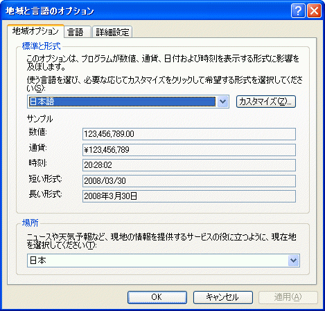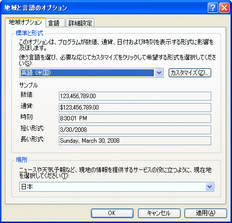 ユーザーの既定言語識別子であるから、下図のように英語(米国)に変更すると識別子は1033(米国)になる。