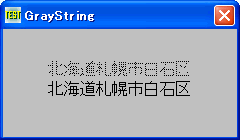 '================================================================ '= テキストをグレー表示で出力 '= (GrayString.bas) '================================================================ #include "Windows.bi" ' テキストをグレー表示で出力 Declare Function Api_GrayString& Lib "user32" Alias "GrayStringA" (ByVal hDC&, ByVal hBrush&, ByVal lpOutputFunc&, ByVal lpData$, ByVal nCount&, ByVal X&, ByVal Y&, ByVal nWidth&, ByVal nHeight&) ' バックグラウンドの塗りつぶしモード設定 Declare Function Api_SetBkMode& Lib "gdi32" Alias "SetBkMode" (ByVal hDC&, ByVal iBkMode&) ' 文字を描画 Declare Function Api_TextOut& Lib "gdi32" Alias "TextOutA" (ByVal hDC&, ByVal nXStart&, ByVal nYStart&, ByVal lpString$, ByVal cbString&) ' 指定されたウィンドウのクライアント領域または画面全体を表すディスプレイデバイスコンテキストのハンドルを取得 Declare Function Api_GetDC& Lib "user32" Alias "GetDC" (ByVal hWnd&) ' デバイスコンテキストを解放 Declare Function Api_ReleaseDC& Lib "user32" Alias "ReleaseDC" (ByVal hWnd&, ByVal hDC&) #define TRANSPARENT 1 '背景色を設定しない '================================================================ '= '================================================================ Declare Sub MainForm_Start edecl () Sub MainForm_Start() Var Str As String Var hDC As Long Var Ret As Long Str = "北海道札幌市白石区" hDC = Api_GetDC(GethWnd) Ret = Api_GrayString(hDC, ByVal 0, ByVal 0, Str, Len(Str), 45, 30, 0, 0) Ret = Api_SetBkMode(hDC, TRANSPARENT) Ret = Api_TextOut(hDC, 45, 50, Str, Len(Str)) Ret = Api_ReleaseDC(GethWnd, hDC) End Sub '================================================================ '= '================================================================ While 1 WaitEvent Wend Stop End