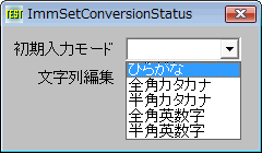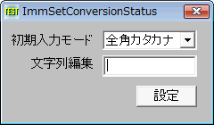 '================================================================ '= IMEの初期方式を設定 '= (ImmSetConversionStatus.bas) '================================================================ #include "Windows.bi" ' ウィンドウに関連付けされた入力コンテキストを取得 Declare Function Api_ImmGetContext& Lib "imm32" Alias "ImmGetContext" (ByVal hWnd&) ' ウィンドウに関連付けされた入力コンテキストを開放 Declare Function Api_ImmReleaseContext& Lib "imm32" Alias "ImmReleaseContext" (ByVal hWnd&, ByVal hIMC&) ' IMEのオープン状態を取得 Declare Function Api_ImmGetOpenStatus& Lib "imm32" Alias "ImmGetOpenStatus" (ByVal hIMC&) ' IMEのオープン状態を設定 Declare Function Api_ImmSetOpenStatus& Lib "imm32" Alias "ImmSetOpenStatus" (ByVal hIMC&, ByVal fOpen&) ' 現在の変換状態を設定 Declare Function Api_ImmSetConversionStatus& Lib "imm32" Alias "ImmSetConversionStatus" (ByVal hIMC&, ByVal fdwConversion&, ByVal fdwSentence&) ' 入力モードを示す定数の宣言 #define IME_CMODE_CHARCODE &H20 '文字コード入力 #define IME_CMODE_CHINESE &H1 'NATIVEモード(設定しない場合ALPHANUMERICモード) #define IME_CMODE_EUDC &H200 'EUDC変換モード #define IME_CMODE_FULLSHAPE &H8 '全角モード(設定しないとき、半角モード) #define IME_CMODE_HANGEUL &H1 'NATIVEモード(設定しない場合ALPHANUMERICモード) #define IME_CMODE_HANJACONVERT &H40 'HANJA変換モード #define IME_CMODE_JAPANESE &H1 'NATIVEモード(設定しない場合ALPHANUMERICモード) #define IME_CMODE_KATAKANA &H2 'カタカナモード(設定しない場合ひらがなモード) #define IME_CMODE_LANGUAGE &H3 ' #define IME_CMODE_NATIVE &H1 'NATIVEモード(設定しない場合ALPHANUMERICモード) #define IME_CMODE_NOCONVERSION &H100 '変換しない(設定しないとき、変換する) #define IME_CMODE_ROMAN &H10 'ローマ字変換モード #define IME_CMODE_SOFTKBD &H80 'ソフトキーボードモード #define IME_CMODE_SYMBOL &H400 'シンボルモード #define IME_CONFIG_GENERAL 1 ' #define IME_CONFIG_REGISTERWORD 2 ' #define IME_CONFIG_SELECTDICTIONARY 3 ' ' 変換モードを示す定数の宣言 #define IME_SMODE_AUTOMATIC &H4 '自動モードで変換 #define IME_SMODE_NONE &H0 'センテンスに関する情報はなし #define IME_SMODE_PHRASEPREDICT &H8 '次の文字を予想するためにフレーズ情報を使う #define IME_SMODE_PLURALCLAUSE &H1 '変換のための複文情報を使う #define IME_SMODE_SINGLECONVERT &H2 '単漢字変換する Var Shared Text1 As Object Var Shared Text2 As Object Var Shared Edit1 As Object Var Shared Combo1 As Object Var Shared Button1 As Object Text1.Attach GetDlgItem("Text1") : Text1.SetFontSize 14 Text2.Attach GetDlgItem("Text2") : Text2.SetFontSize 14 Edit1.Attach GetDlgItem("Edit1") : Edit1.SetFontSize 14 Combo1.Attach GetDlgItem("Combo1") : Combo1.SetFontSize 14 Button1.Attach GetDlgItem("Button1") : Button1.SetFontSize 14 Var Shared iStatus(4) As Long '================================================================ '= '================================================================ Declare Sub MainForm_Start edecl () Sub MainForm_Start() Combo1.AddString "ひらがな" iStatus(0) = IME_CMODE_FULLSHAPE Or IME_CMODE_JAPANESE Combo1.AddString "全角カタカナ" iStatus(1) = IME_CMODE_FULLSHAPE Or IME_CMODE_LANGUAGE Combo1.AddString "半角カタカナ" iStatus(2) = IME_CMODE_LANGUAGE Combo1.AddString "全角英数字" iStatus(3) = IME_CMODE_FULLSHAPE Combo1.AddString "半角英数字" iStatus(4) = IME_CMODE_ALPHANUMERIC End Sub '================================================================ '= '================================================================ Declare Sub Button1_on edecl () Sub Button1_on() Var hIMC As Long Var ConversionStatus As Long Var SentenceStatus As Long Var Ret As Long 'ウィンドウに関連付けされた入力コンテキストを取得 hIMC = Api_ImmGetContext(GethWnd) '入力コンテキストを取得できたときは If hIMC <> 0 Then 'IMEのオープン状態でないときは If Api_ImmGetOpenStatus(hIMC) <> Not False Then 'IMEをオープン Ret = Api_ImmSetOpenStatus(hIMC, Not False) '初期入力モードを指定 ConversionStatus = iStatus(Combo1.GetCursel) '初期変換モードを指定 SentenceStatus = IME_SMODE_PHRASEPREDICT 'IMEの初期方式を設定 Ret = Api_ImmSetConversionStatus(hIMC, ConversionStatus, SentenceStatus) 'IMEをクローズ Ret = Api_ImmSetOpenStatus(hWnd, False) End If '入力コンテキストを開放 Ret = Api_ImmReleaseContext(GethWnd, hIMC) End If SetImeMode 1 Edit1.SetFocus End Sub '================================================================ '= '================================================================ Declare Sub Edit1_SetFocus edecl () Sub Edit1_SetFocus() Edit1.SetSelText 0, 0 End Sub '================================================================ '= '================================================================ While 1 WaitEvent Wend Stop End