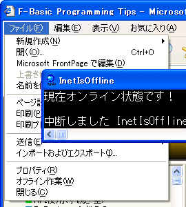'= (InetIsOffline.bas) '================================================================ ' システムがインターネットに接続しているかどうかを判断 Declare Function Api_InetIsOffline& Lib "url" Alias "InetIsOffline" (ByVal dwFlags&) If Api_InetIsOffline(0) = 0 Then Print "現在オンライン状態です!" Else Print "現在オフライン状態です!" End If Stop End