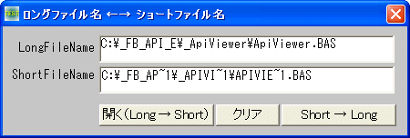 ShortFileName欄に適当なショート形式パス名を入力後、「Short → Long」をクリックするとそのパスが存在した場合、ロング形式のパス名が表示されます。