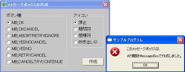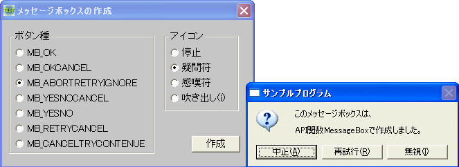 APIでメッセージボックスを作成します。ボタン種・アイコンをチェックして作成ボタンをクリックします。