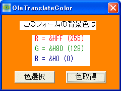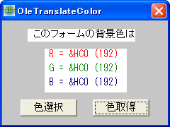OleTranslateColor カラーコードへの変換(OLE_COLORタイプをCOLORREFに変換)