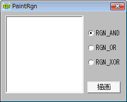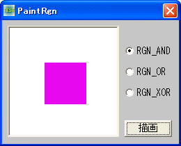 例では、二つの領域(20, 20)-(110, 110)と(50, 50)-(140, 140)を結合(CombineRgn)し、ランダムに作成したブラシ(CreateBrushIndirect)で塗りつぶしています。