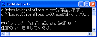 '= (PathFindExists.bas/P) '================================================================ ' 指定のファイルの有無をチェック Declare Function Api_PathFileExists& Lib "shlwapi" Alias "PathFileExistsA" (ByVal lpszPath$) Var FileName As String Var Ret As Long FileName = "c:\fbasicv63\bin\fbasic.exe" GoSub *judge FileName = "c:\fbasicv63\bin\fbasicv63.exe" GoSub *judge Stop End '---------------------------------------------------------------- *judge Ret = Api_PathFileExists(FileName) If Ret <> 0 Then Print FileName & "は存在します!" Else Print FileName & "はありません!" End If Return