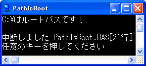 '= (PathIsRoot.bas/P) '================================================================ ' ルートパスかどうかを判断 Declare Function Api_PathIsRoot& Lib "shlwapi" Alias "PathIsRootA" (ByVal pszPath$) Var MyPath As String Var Ret As Long MyPath = "C:\" Ret = Api_PathIsRoot(MyPath) If Ret <> 0 Then Print MyPath & "はルートパスです!" Else Print MyPath & "はルートパスではない!" End If Stop End