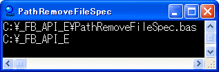 '================================================================ '= パスからファイル名部分を取り除く '= (PathRemoveFileSpec.bas/P) '================================================================ ' パスからファイル名部分を取り除く Declare Sub Api_PathRemoveFileSpec Lib "shlwapi" Alias "PathRemoveFileSpecA" (ByVal pPath$) Var Path As String Path = "C:\_FB_API_E\PathRemoveFileSpec.bas" Print Path Api_PathRemoveFileSpec Path Print Left$(Path, InStr(Path, Chr$(0)) - 1) Stop End
