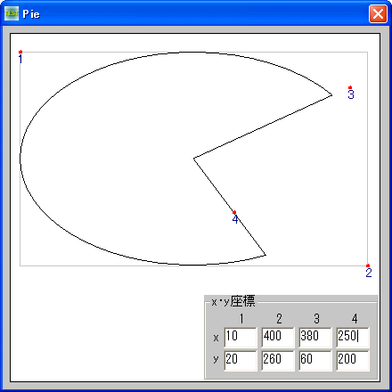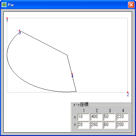 '================================================================ '= 扇形の描画 '= (Pie.bas) '================================================================ #include "Windows.bi" ' 扇形を描画する Declare Function Api_Pie& Lib "gdi32" Alias "Pie" (ByVal hDC&, ByVal X1&, ByVal Y1&, ByVal X2&, ByVal Y2&, ByVal X3&, ByVal Y3&, ByVal X4&, ByVal Y4&) ' 指定されたウィンドウのクライアント領域または画面全体を表すディスプレイデバイスコンテキストのハンドルを取得 Declare Function Api_GetDC& Lib "user32" Alias "GetDC" (ByVal hWnd&) ' デバイスコンテキストを解放 Declare Function Api_ReleaseDC& Lib "user32" Alias "ReleaseDC" (ByVal hWnd&, ByVal hDC&) Var Shared Text(6) As Object Var Shared Edit(7) As Object Var Shared Picture1 As Object Var Shared Group1 As Object Var Shared Timer1 As Object For i = 0 To 7 If i < 6 Then Text(i).Attach GetDlgItem("Text" & Trim$(Str$(i + 1))) : Text(i).SetFontSize 14 End If Edit(i).Attach GetDlgItem("Edit" & Trim$(Str$(i + 1))) : Edit(i).SetFontSize 14 Next Picture1.Attach GetDlgItem("Picture1") Group1.Attach GetDlgItem("Group1") : Group1.SetFontSize 14 Timer1.Attach GetDlgItem("Timer1") Var Shared hDC As Long '================================================================ '= '================================================================ Declare Sub MainForm_Start edecl () Sub MainForm_Start() ShowWindow -1 Cls hDC = Api_GetDC(Picture1.GethWnd) Timer1.SetInterval 100 Timer1.Enable -1 End Sub '================================================================ '= '================================================================ Declare Sub Timer1_Timer edecl () Sub Timer1_Timer() Var x(3) As Long Var y(3) As Long Var Ret As Long Picture1.Cls For i = 0 To 3 x(i) = Val(GetDlgItemText("Edit" & Trim$(Str$(i + 1)))) y(i) = Val(GetDlgItemText("Edit" & Trim$(Str$(i + 5)))) Next Picture1.Line(x(0), y(0)) - (x(1), y(1)), , 14, b Ret = Api_Pie(hDC, x(0), y(0), x(1), y(1), x(2), y(2), x(3), y(3)) For i = 0 To 3 Picture1.SetDrawWidth 4 Picture1.Pset(x(i), y(i)), 5 Picture1.SetDrawWidth 0 Picture1.Symbol(x(i) - 1, y(i) + 1), Trim$(Str$(i + 1)), 1, 1, 2 Next End Sub '================================================================ '= '================================================================ Declare Sub MainForm_QueryClose edecl () Sub MainForm_QueryClose() Var Ret As Long Ret = Api_ReleaseDC(Picture1.GethWnd, hDC) End End Sub '================================================================ '= '================================================================ While 1 WaitEvent Wend Stop End
