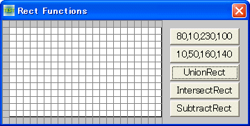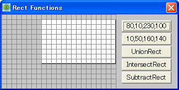 左:上記二つの矩形領域を内包する矩形を描画(UnionRect) 右:上記二つの領域の重なっている部分の領域を描画(IntersectRect)