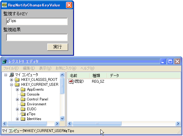 例では、10秒間のタイムアウト時間を設けその間にレジストリに変化があれば即通知、無ければタイムアウトと表示されます。