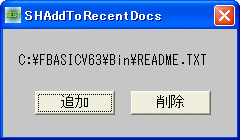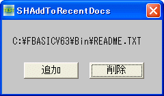 例では、C:\FBASIC\Bin\README.TXTを「最近使ったファイル」リストに追加及び削除した状態を示しています。