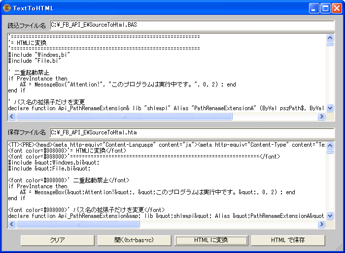 「HTMLに変換」のコード(bas)を読み込んでHTMLに変換した状態。注釈部「'」を見つけるとその行を暗緑色で表示させます。<font color=#008000>部