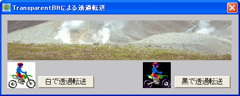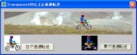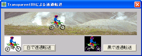 '================================================================ '= TransparentBltによる透過転送テスト '= (TransparentBlt.bas) '================================================================ #include "Windows.bi" ' 透明色を指定してビットマップをコピー Declare Function Api_TransparentBlt& Lib "msimg32" Alias "TransparentBlt" (ByVal hDC&, ByVal x&, ByVal y&, ByVal nWidth&, ByVal nHeight&, ByVal hSrcDC&, ByVal xSrc&, ByVal ySrc&, ByVal nSrcWidth&, ByVal nSrcHeight&, ByVal crTransparent&) ' 指定されたウィンドウのクライアント領域または画面全体を表すディスプレイデバイスコンテキストのハンドルを取得 Declare Function Api_GetDC& Lib "user32" Alias "GetDC" (ByVal hWnd&) ' デバイスコンテキストを解放 Declare Function Api_ReleaseDC& Lib "user32" Alias "ReleaseDC" (ByVal hWnd&, ByVal hDC&) Var shared Bitmap As Object Var shared Picture1 As Object Var shared Picture2 As Object Var shared Picture3 As Object Var Shared Button1 As Object Var Shared Button2 As Object Picture1.Attach GetDlgItem("Picture1") Picture2.Attach GetDlgItem("Picture2") Picture3.Attach GetDlgItem("Picture3") Button1.Attach GetDlgItem("Button1") : Button1.SetFontSize 14 Button2.Attach GetDlgItem("Button2") : Button2.SetFontSize 14 BitmapObject Bitmap Var shared RGBColor As Long '透明色 Var shared hDC0 As Long Var shared hDC1 As Long Var shared hDC2 As Long Var shared hDC3 As Long Var shared xPos As Integer '================================================================ '= '================================================================ Declare Sub Mainform_Start edecl () Sub Mainform_Start() Bitmap.LoadFile "BackColor2.bmp" Picture1.DrawBitmap Bitmap, 0, 0 Bitmap.DeleteObject Bitmap.LoadFile "bike1.bmp" Picture2.DrawBitmap Bitmap, 0, 0 Bitmap.DeleteObject Bitmap.LoadFile "bike5.bmp" Picture3.DrawBitmap Bitmap, 0, 0 Bitmap.DeleteObject hDC1 = Api_GetDC(Picture1.GethWnd) End Sub '================================================================ '= '================================================================ Declare Sub Tensou_dsp edecl () Sub Tensou_dsp() Var Ret As Long Ret = Api_TransparentBlt(hDC1, xPos, 10, 56, 52, hDC0, 0, 0, 56, 52, RGBColor) End Sub '================================================================ '= 透明色を白 '================================================================ Declare Sub Button1_on edecl () Sub Button1_on() RGBColor = RGB(255, 255, 255) hDC2 = Api_GetDC(Picture2.GethWnd) hDC0 = hDC2 xPos = 150 Tensou_dsp End Sub '================================================================ '= 透明色を黒 '================================================================ Declare Sub Button2_on edecl () Sub Button2_on() RGBColor = RGB(0, 0, 0) hDC3 = Api_GetDC(Picture3.GethWnd) hDC0 = hDC3 xPos = 250 Tensou_dsp End Sub '================================================================ '= '================================================================ Declare Sub Mainform_QueryClose edecl (Cancel%, ByVal Mode%) Sub Mainform_QueryClose(Cancel%, ByVal Mode%) If Cancel% = 0 Then Ret = Api_ReleaseDC(Picture1.GethWnd, hDC1) Ret = Api_ReleaseDC(Picture2.GethWnd, hDC2) Ret = Api_ReleaseDC(Picture3.GethWnd, hDC3) End End If End Sub '================================================================ '= '================================================================ While 1 WaitEvent Wend Stop End