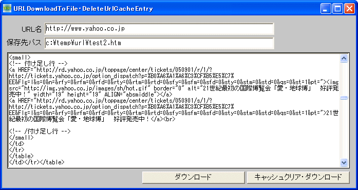 URLのHTML等をダウンロードしファイルに保存します。また、インターネット一時ファイル(キャッシュ)を削除します。