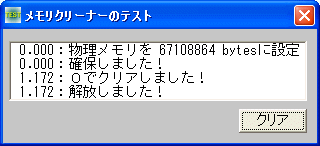 '= (VirtualAlloc.bas) '================================================================ #include "Windows.bi" ' 仮想アドレス空間に領域を確保 Declare Function Api_VirtualAlloc& Lib "kernel32" Alias "VirtualAlloc" (lpAddress As Any, ByVal dwSize&, ByVal flAllocationType&, ByVal flProtect&) ' 仮想アドレス空間に確保した領域を解放 Declare Function Api_VirtualFree& Lib "kernel32" Alias "VirtualFree" (lpAddress As Any, ByVal dwSize&, ByVal dwFreeType&) ' メモリブロックを指定の値で初期化 Declare Sub FillMemory Lib "Kernel32" Alias "RtlFillMemory" (Destination As Any, ByVal Length&, ByVal Fill As Byte) ' システムが起動してからの起動時間を取得 Declare Function Api_timeGetTime& Lib "winmm" Alias "timeGetTime" () #define MEM_COMMIT &H1000 'メモリ内またはディスクのページングファイル内に、指定されたページ領域に相当する物理的な記憶域を割り当 #define MEM_DECOMMIT &H4000 '物理メモリへのコミット解除 #define PAGE_READWRITE &H4 'コミット済みのページ領域に対する読み取りアクセスと書き込みアクセスの両方を許可 #define PAGE_NOCACHE &H200 'コミット済みのページ領域に対するキャッシュを禁止 Var Shared List1 As Object Var Shared Button1 As Object List1.Attach GetDlgItem("List1") : List1.SetFontSize 14 Button1.Attach GetDlgItem("Button1") : Button1.SetFontSize 14 '================================================================ '= '================================================================ Declare Sub Button1_on edecl () Sub Button1_on() Var AllocPtr As Long 'アドレス保存用変数 Var cSize As Long '掃除するサイズ Var nStart As Long Var nEnd As Long Var Ret As Long List1.ResetContent nStart = Api_TimeGetTime() '掃除するメモリーのサイズを設定 cSize = 64 '未指定で64メガバイトとする cSize = cSize * 1024 * 1024 'メガバイトをバイトに変換 nEnd = Api_TimeGetTime() List1.AddString Format$((CDbl(nEnd) - CDbl(nStart)) / 1000, "##.###") & ":物理メモリを" & Str$(cSize) & " bytesに設定!" 'メモリーの掃除 AllocPtr = Api_VirtualAlloc(ByVal 0, cSize, MEM_COMMIT, PAGE_READWRITE Or PAGE_NOCACHE) nEnd = Api_TimeGetTime() List1.AddString Format$((CDbl(nEnd) - CDbl(nStart)) / 1000, "##.###") & ":確保しました!" FillMemory ByVal AllocPtr, cSize, 0 nEnd = Api_TimeGetTime() List1.AddString Format$((CDbl(nEnd) - CDbl(nStart)) / 1000, "##.###") & ":0でクリアしました!" Ret = Api_VirtualFree(AllocPtr, cSize, MEM_DECOMMIT) nEnd = Api_TimeGetTime() List1.AddString Format$((CDbl(nEnd) - CDbl(nStart)) / 1000, "##.###") & ":解放しました!" End Sub '================================================================ '= '================================================================ While 1 WaitEvent Wend Stop End