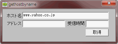 初期状態では、www.yahoo.co.jp が入力されています。ホスト名を入力し取得ボタンをクリックすると該当アドレスを表示し、受信に費やした時間を表示します。