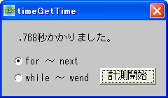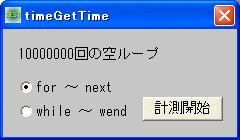 例では、for 〜 next および、while 〜 wend で 10000000回の空ループの時間を計測しています。